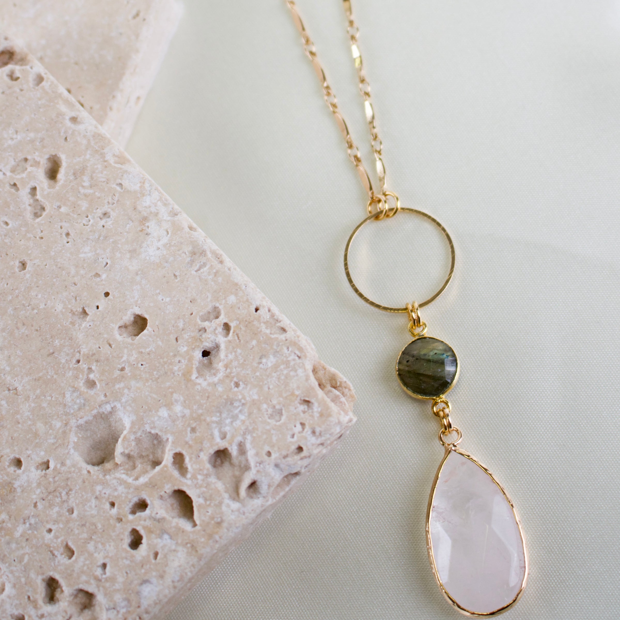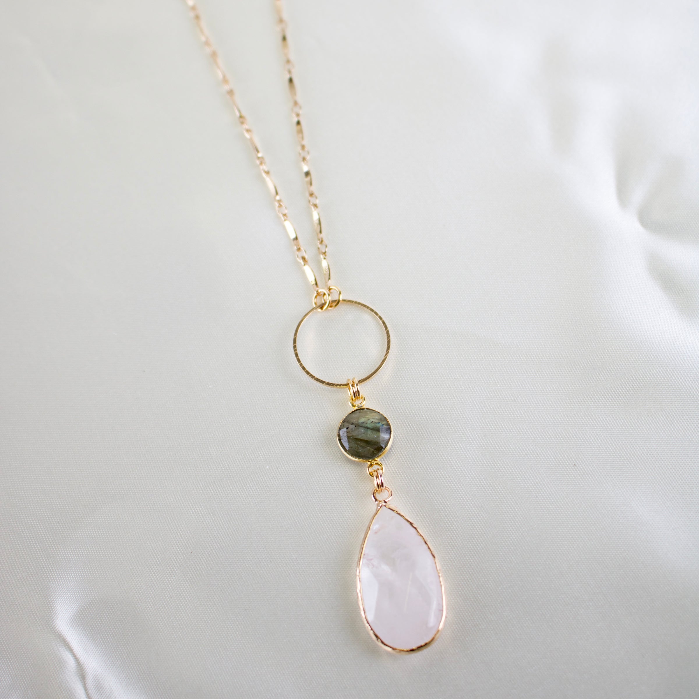 One necklace with two crystals is what you get with Cherice! This necklaces features a faceted teardrop shaped clear quartz pendant suspended from a labradorite crystal.