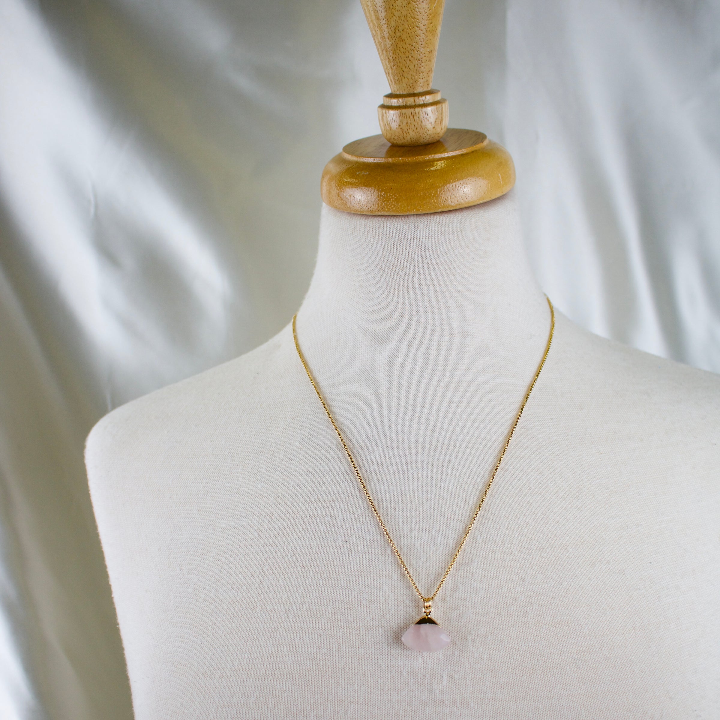 Remi is our first adjustable chain necklace! A fan shaped Rose Quartz crystal pendant suspended on an adjustable gold chain. You simply slide the toggle along the chain to create the perfect length! The premise behind creating a style with an adjustable chain is so that the piece is more versatile, and works with more than one neckline!