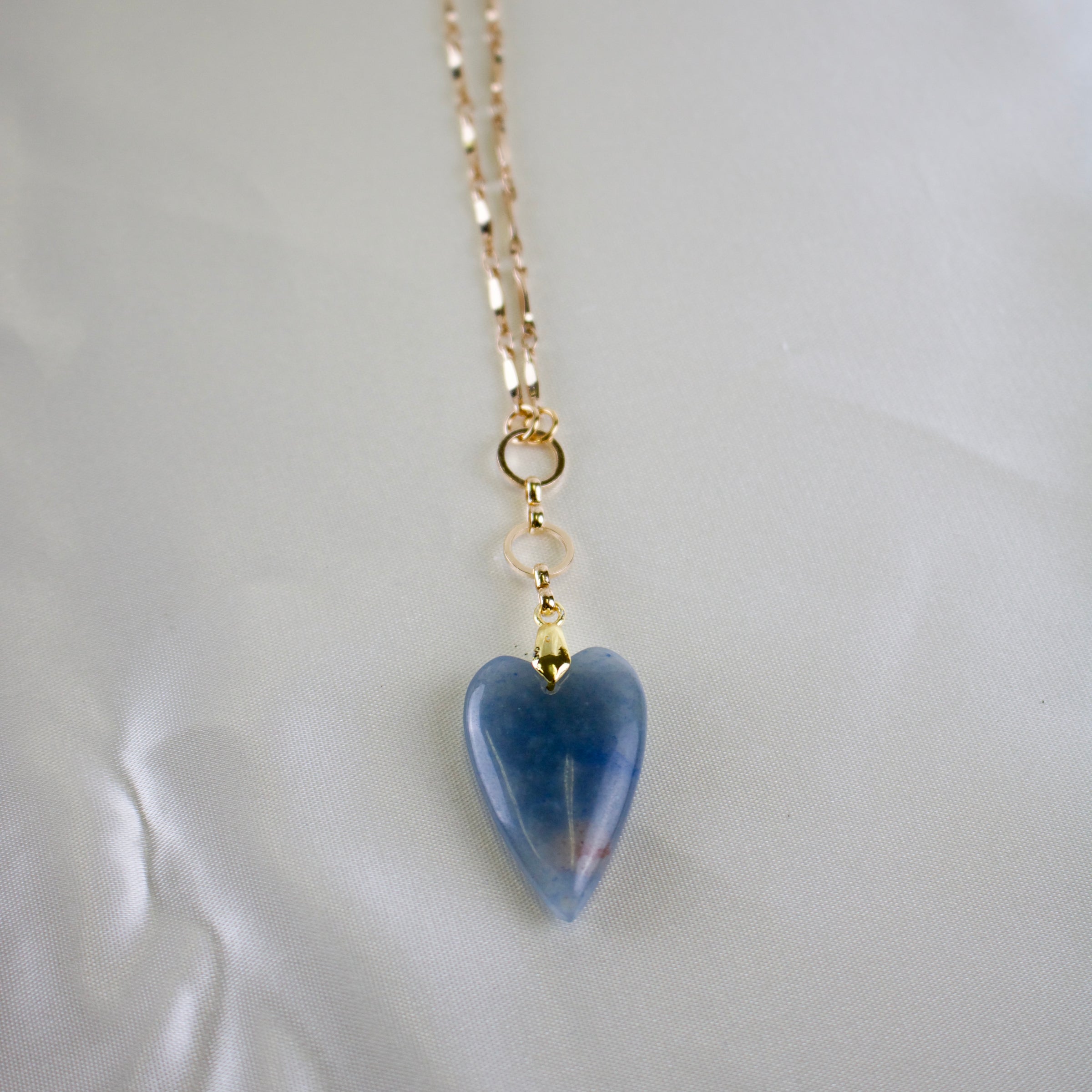 Product Features: • Blue Aventurine elongated heart pendant approx. 1.25" • 28" of gold plated brass bar chain - Nickel Free • Due to the nature of the materials, each pendant may slightly vary in colour and markings.