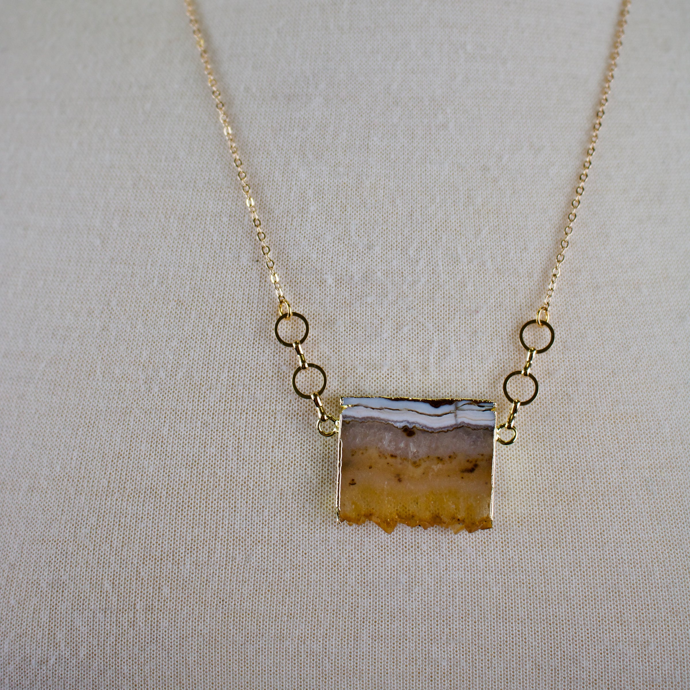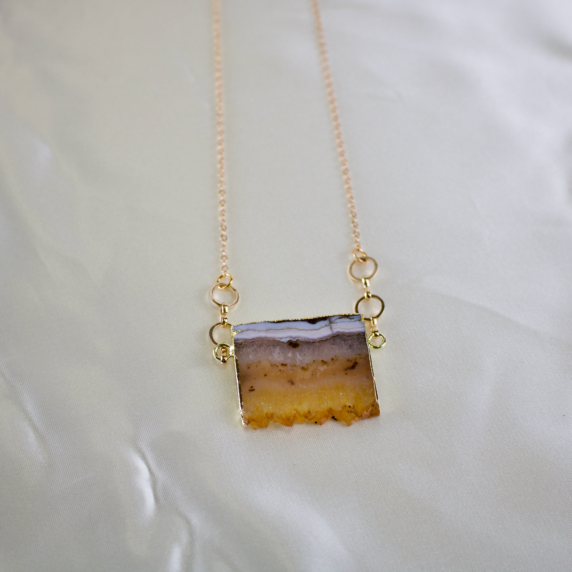 Product Features: • 20" of gold plated brass chain - Nickel Free • Rectangle citrine slice pendant (approx 1.5" wide) with gold trim • Gold plated brass lobster clasp closure - Nickel free • Due to the nature of the materials, each pendant will slightly vary in size, colour and shape.
